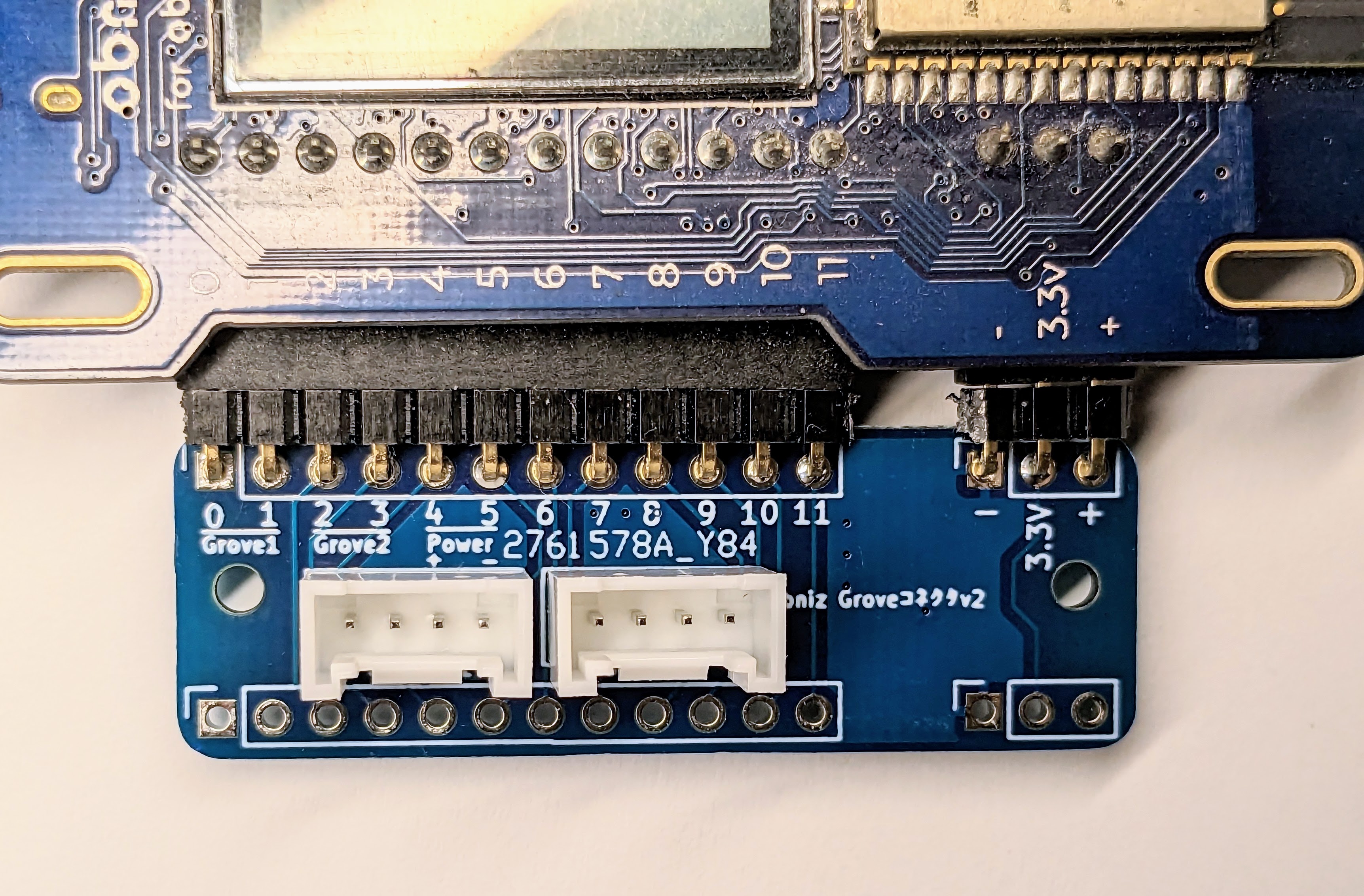 基板の下部には上のIOの並びと同様のソケットがあり、追加ではんだ付けすることでGrove以外のセンサーを繋げます。